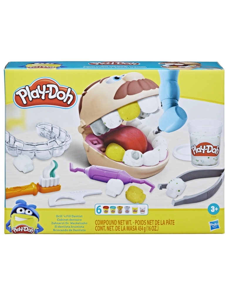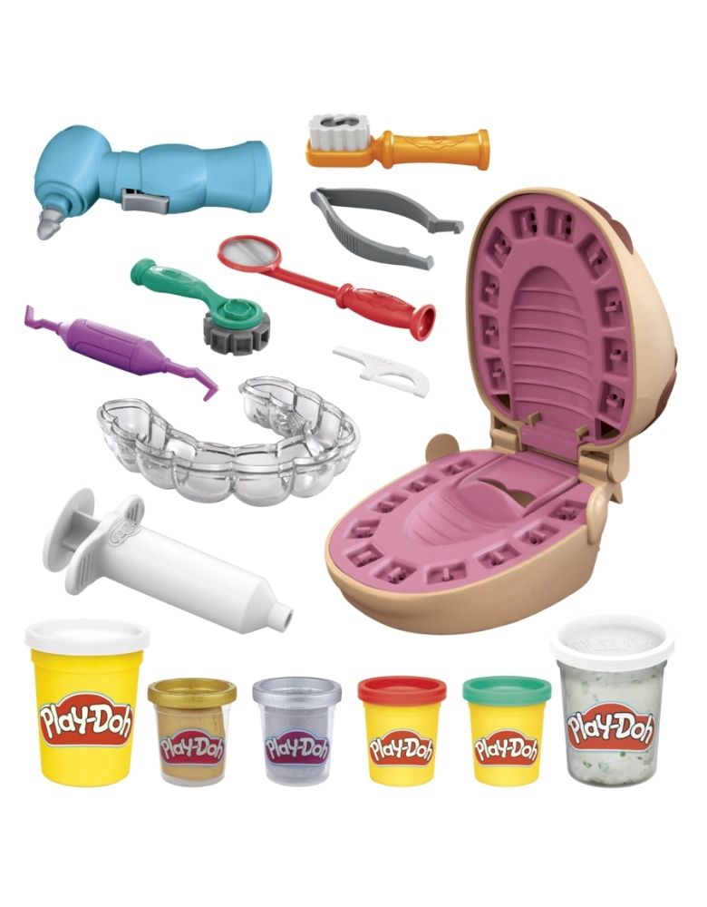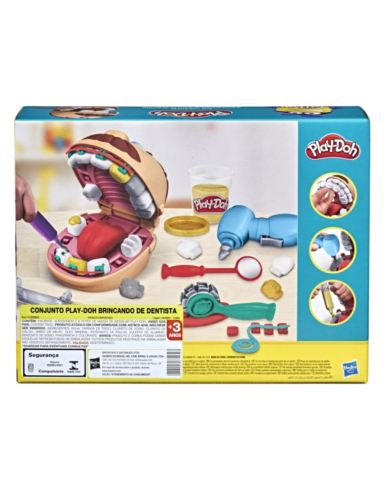 Mesmo sendo um pouco assustador ir ao dentista, as crianças podem se divertir com o kit Brincando de dentista. As crianças podem colocar língua de Play-Doh do paciente para fora e usar a molde de dentes para criar toda uma arcada dentária. As crianças podem usar a broca manual para perfurar os dentes de Play-Doh até achar a cárie e depois aplicar a obturação com a seringa. A massa cor de cárie vem com manchas verdes para criar um dente estragado e as massas dourada e prateada servem para criar aparelhos ortodônticos e obturações. Com 10 ferramentas e 8 potes de massa de modelar Play-Doh atóxica, este kit é um excelente presente para crianças a partir dos 3 anos. Play-Doh e todas as propriedades relacionadas são marcas registradas da Hasbro.