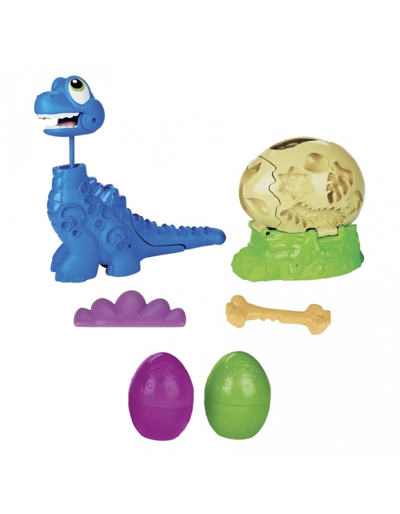 O bebê Bronto nasce do ovo: basta pressionar a sua cauda para ajudá-lo a sair do ovo. Depois basta retirar o dinossauro do ovo para brincar. As crianças podem colocar massa Play-Doh no dinossauro e pressionar a cauda para ver o pescoço de Bronto crescer. É possível decorar o dinossauro com folhas, flores e até uma gravata borboleta criadas com os moldes no dinossauro e no ovo. Ossos e espinhos podem ser criados com as 2 ferramentas. O kit vem com 2 ovos de dinossauros com 70 g de massa de modelar Play-Doh em 3 cores diferentes - verde, roxa e amarela. Este kit de artes e artesanato é um presente ideal para crianças a partir de 3 anos.