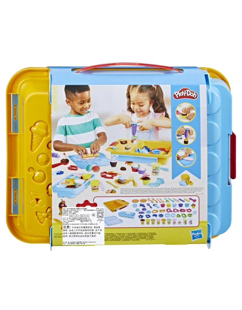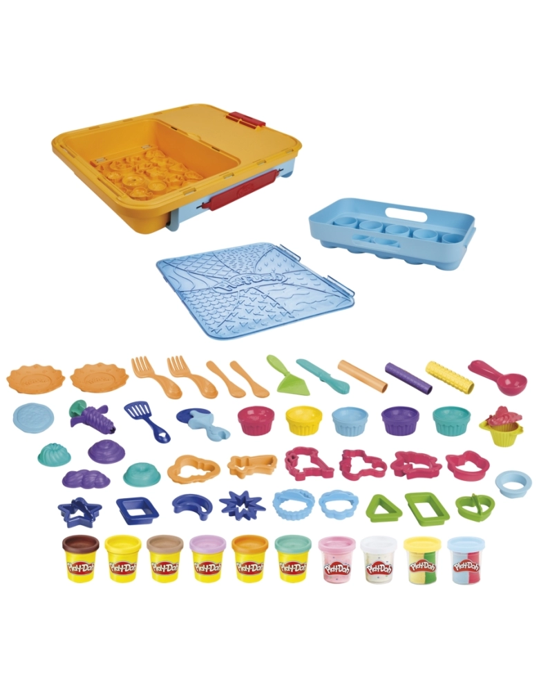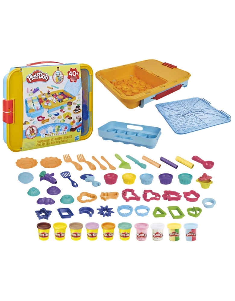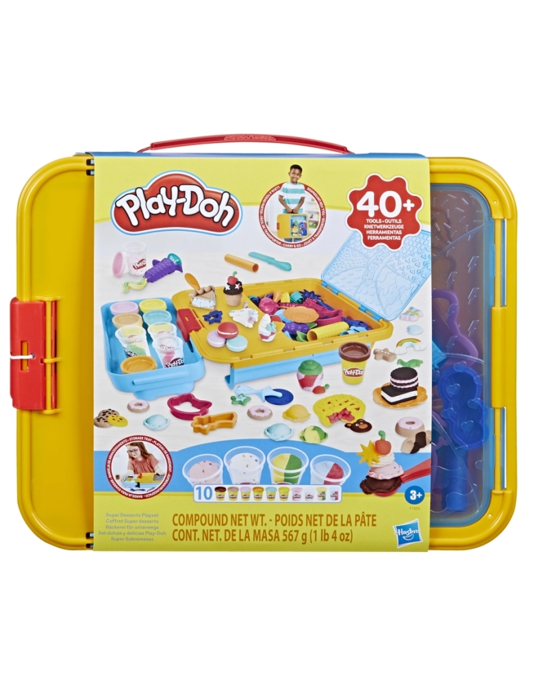 Com mais de 40 acessórios Play-Doh, 10 potes Play-Dos e maleta, este brinquedo criativo para meninos e meninas vai fazer a diversão da criançada. O kit traz vários cortadores, rolos, carimbos, moldes e muito mais para ajudar as crianças a criarem tortas, cupcakes, sorvetes e outras sobremesas. Este kit Play-Doh vem com 2 potes de Play-Doh com confete, 2 potes com duas cores e potes das cores amarela, marrom, rosa, bege, laranja e azul. Depois da brincadeira, todos os potes e ferramentas podem ser guardados nos compartimentos. A tampa podem ser usada como área de brincadeira para proteger as superfícies da casa da massa Play-Doh. A alça na maleta facilita o transporte do kit Play-Doh para qualquer lugar. Excelente atividade manual para crianças que gostam de artes e artesanato. Hasbro, Play-Doh e todas as propriedades relacionadas são marcas registradas da Hasbro.