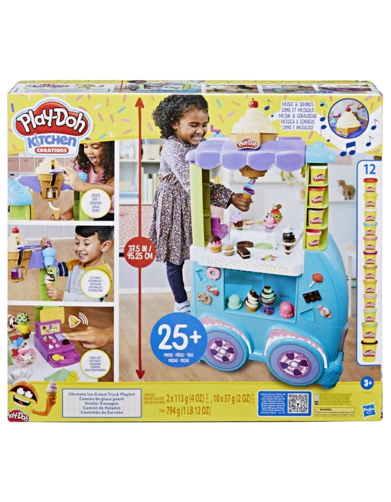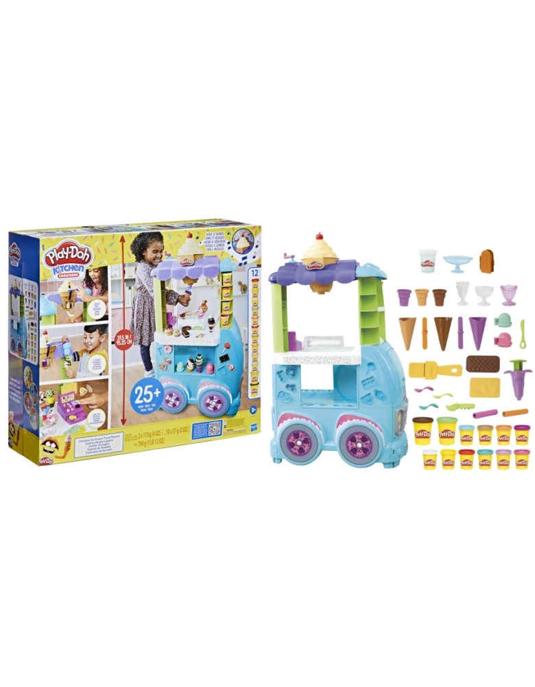 Esta brinquedo é perfeito para crianças expressarem sua imaginação na cozinha! Muita criatividade com este caminhão de sorvete. As crianças podem criar sorvetes de mentirinha e decorar com granulados com os moldes e ferramentas. Vem com uma máquina registradora. As crianças podem se imaginar como donas dos seu próprio negócio. O espaço de armazenamento vem com portas reais para deixar tudo organizado no final. É fácil de colocar os pedaços de massa de volta nos potes. Este kit traz cones, pratos, carimbos, moldes e outras ferramentas Play-Doh. Vem com 12 cores clássicas como marrom, azul, verde, rosa e branca. Hasbro, Play-Doh, and all related properties are trademarks of Hasbro.