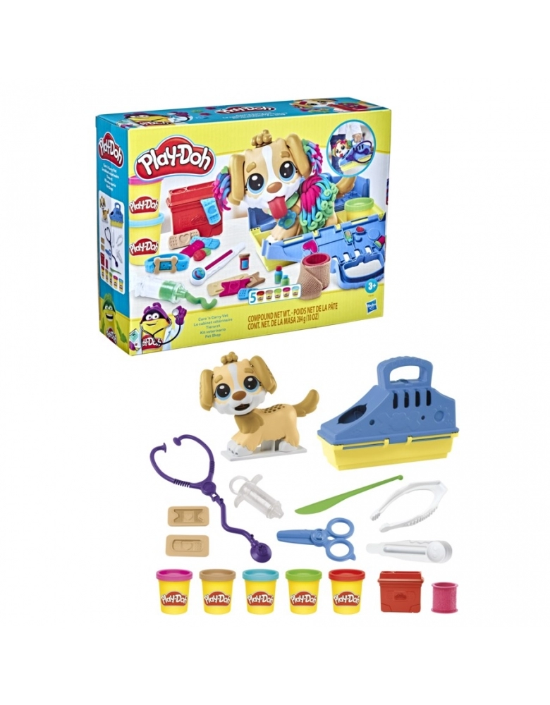É hora de cuidar do pet com este kit com ferramentas para crianças a partir dos 3 anos brincar de veterinário com Play-Doh. As crianças podem criar a língua e pêlos do cachorrinho com Play-Doh, além de poder criar estilos diferentes pro pet. A casinha do pet também inclui moldes divertidos para criar remédios de mentirinha Play-Doh e faixas. As crianças irão se divertir com o carimbo de estetoscópio de brinquedo, termômetro, 5 tipos diferentes de curativos e muito mais. O brinquedo vem com 10 ferramentas e 5 potes de Play-Doh para muita diversão (contém trigo). Um presente criativo para aniversários ou outras celebrações!