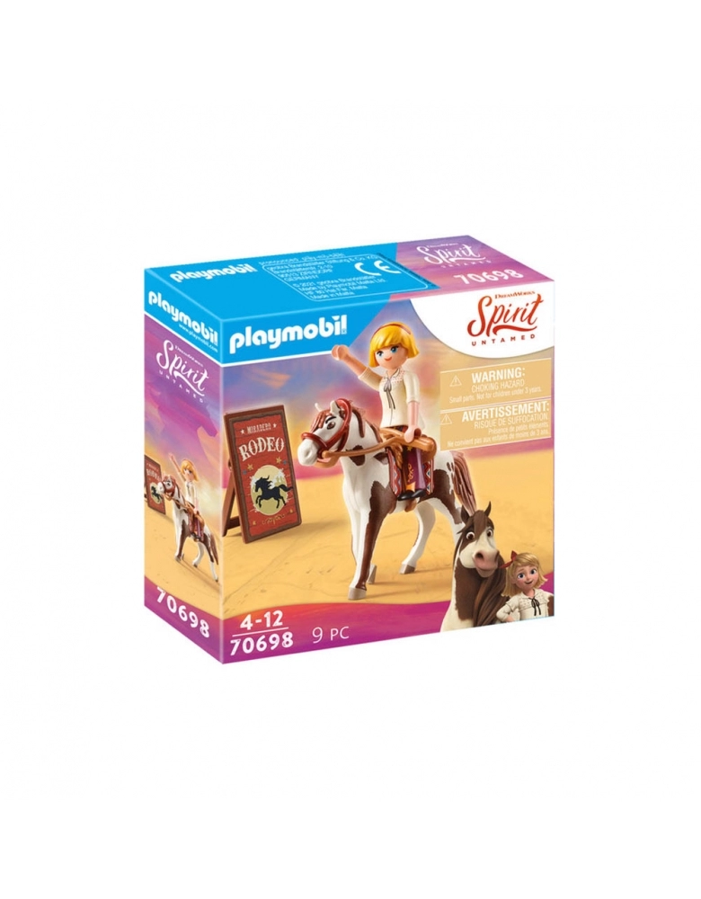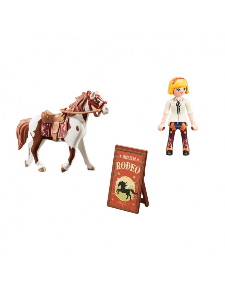 Abigail é uma ávida cavaleira de rodeio! Com a ajuda de Boomerang, ela pode laçar qualquer alvo em movimento! Como amante de cavalos, Abigail também é uma entusiasta cavaleira de rodeio. Ela experimenta com entusiasmo as várias disciplinas junto com seu cavalo Boomerang. Seja em corridas de barril ou slalom: Abigail e Boomerang são uma figura excelente em todos os lugares. Vamos, Abigail! O playset inclui a personagem Abigail da DreamWorks Spirit com seu cavalo Boomerang, sela, freio e uma placa de rodeio. A figura pode andar a cavalo.