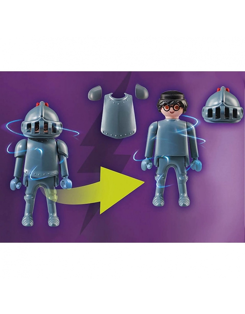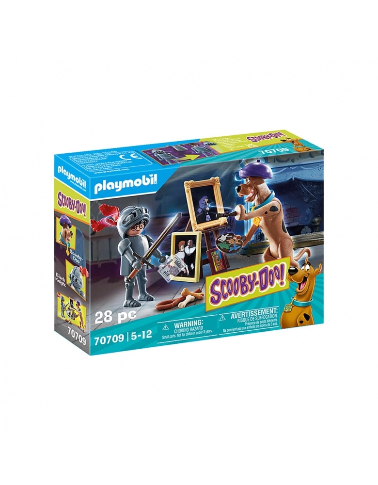 Com Scooby, cavalete e várias pinturas. Você pode tirar a máscara do fantasma! Scooby como um pintor que você pode colecionar! Na lua cheia, a incrível aventura SCOOBY-DOO! Sobre o Cavaleiro Negro começa. Tal como acontece com a magia, o cavaleiro negro ganha vida e assombra todos em sua armadura. Scooby-Doo está procurando por pistas nas pinturas que podem ajudar a capturar o vilão. Pode-se tirar a máscara da figura e revelar a verdadeira identidade do misterioso cavaleiro negro. O conjunto inclui Scooby-Doo, o cavaleiro negro, uma carta fantasma, a armadura fantasma do cavaleiro e acessórios de pintura.