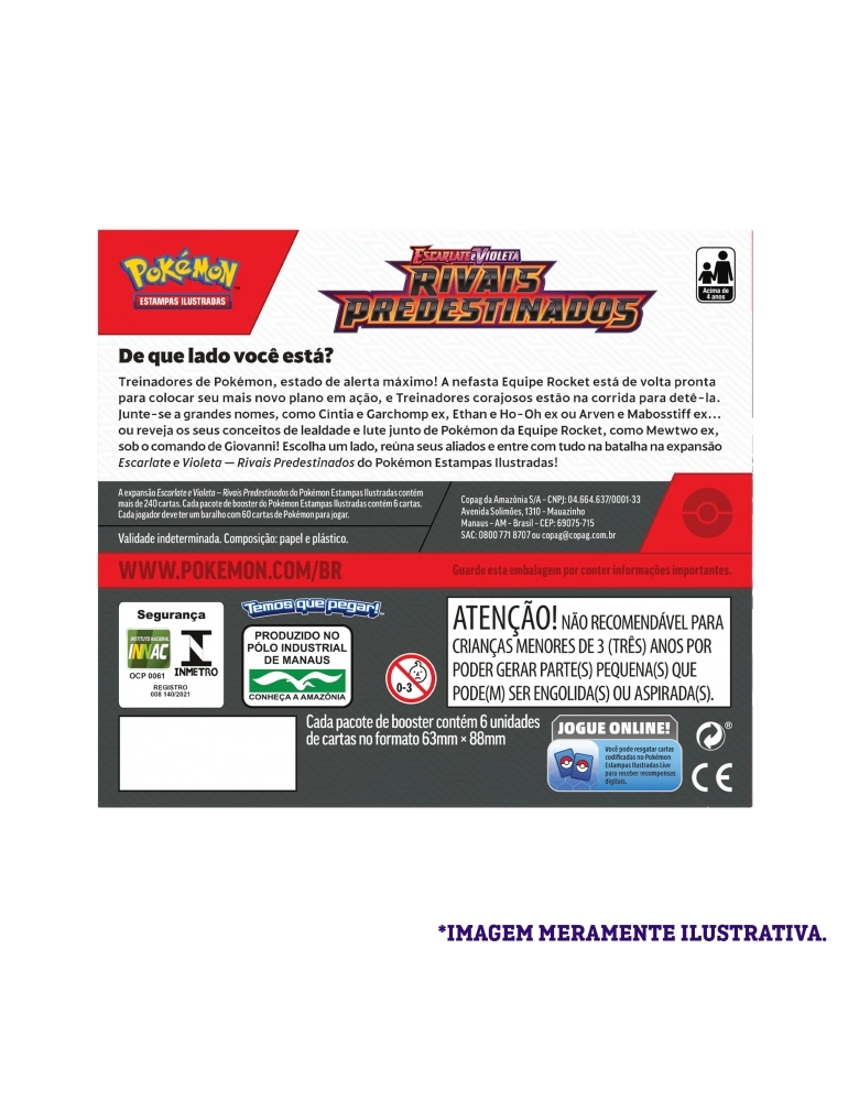 De que lado você está? Treinadores de Pokémon, estado de alerta máximo! A nefasta Equipe Rocket está de volta pronta para colocar seus mais novo plano em ação, e Treinadores corajosos estão na corrida para detê-la. Junte-se a grandes nomes, como Cíntia e Garchomp ex, Ethan e Ho-Oh ex ou Arven e Mabosstiff ex… ou reveja os seus conceitos de lealdade e lute junto de Pokémon da Equipe Rocket, como Mewtwo ex, sob o comando de Giovanni! Escolha um lado, reúna seus aliados e entre com tudo na expansão Escarlate e Violeta – Rivais Predestinados do Pokémon Estampas Ilustradas.