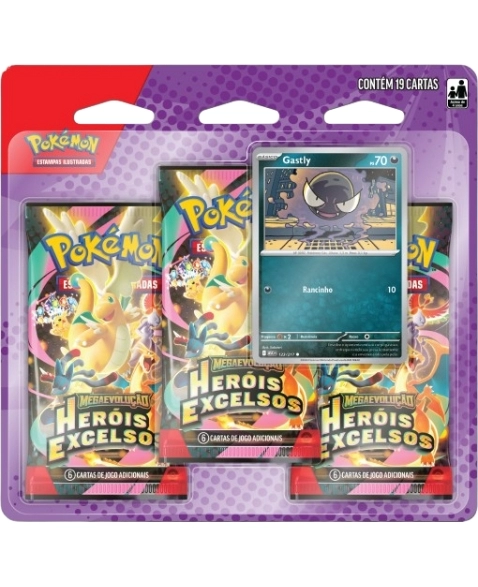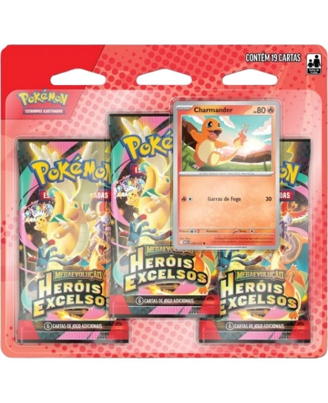 Nesta coleção, você vai encontrar Charmander ou Gastly como uma carta laminada promocional, além de muitos outros Pokémon nos três pacotes de booster da expansão especial Megaevolução – Heróis Excelsos!