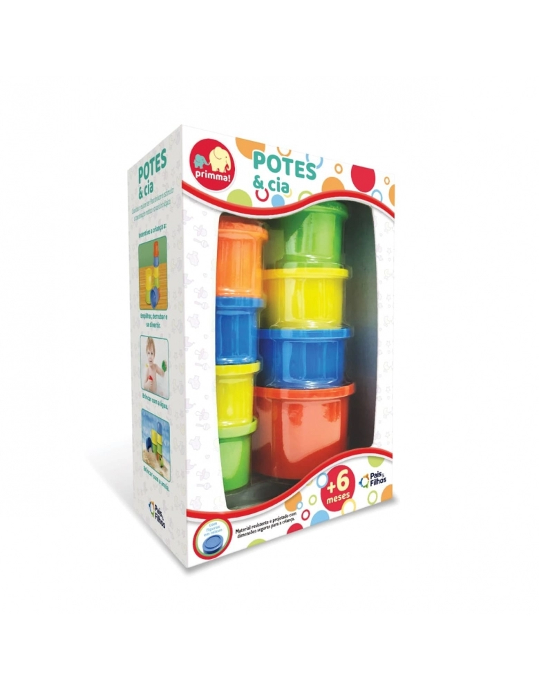 Potes & Cia da Pais & Filhos foi pensado Para Acompanhar o Crescimento Dos Bebês Durante Suas Primeiras Descobertas. São Oito Potes Para Incentivar a Criança a Empilhar, Derrubar, Brincar com Água e Brincar com Areia. As Figuras de Animais em Relevo No Fundo Cada Pote Proporcionam Muito Mais Diversão. Os Potes São Coloridos, Resistentes e Estimulam a Coordenação Motora e o Raciocínio Lógico da Criança.