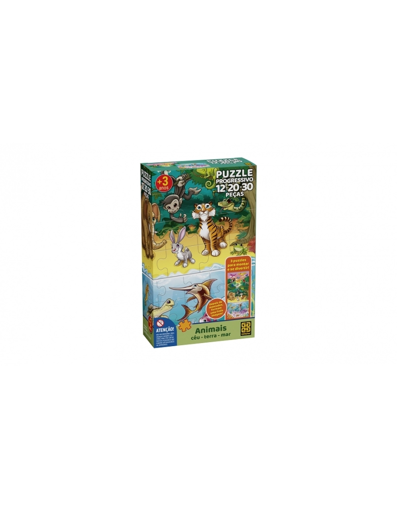 O Puzzle Progressivo traz na mesma caixa três quebra-cabeças diferenciados, em que as quantidades e os tamanhos das peças determinam níveis crescentes de dificuldade. As peças do verso também são diferentes, para facilitar a separação dos modelos. Inicie a montagem pelo quebra-cabeça de 12 peças, a fim de que a montagem das ilustrações de 20 e 30 peças ofereça um desafio progressivo e atraente.