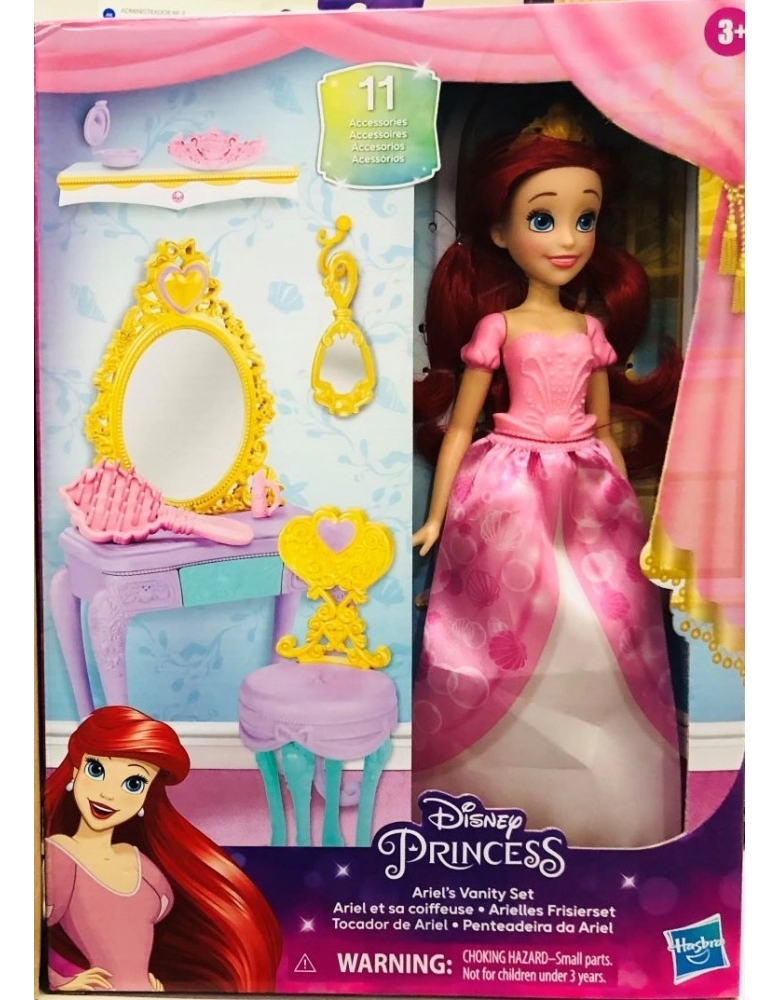 As crianças podem ajudar Ariel a se preparar para a festa com este kit Disney Princess que contém uma boneca princesa Disney de 28 cm de altura, penteadeira, banquinho e muitos acessórios divertidos. As crianças podem brincar de arrumar a boneca. A gaveta da penteadeira abre, para guardar pequenos acessórios, e colocar outros em cima. A boneca Ariel vem com um corpete e saia, sapatos, tiara, colar, espelho, escova, batom, compacto e coroa. Inspirada na famosa personagem da Disney, esta boneca possui cabelos longos que podem ser penteados com a escova incluída