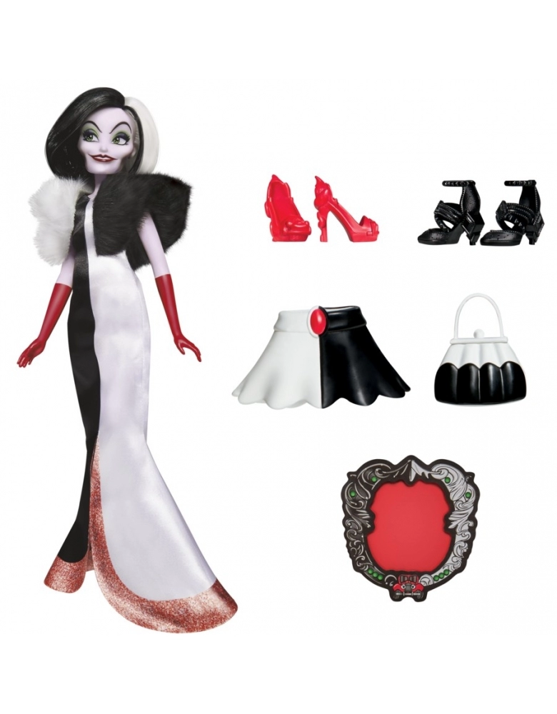 Independentes, confiantes, inesquecíveis e, sem dúvidas, maléficas! As vilãs da Disney estão sempre vestidas da mais alta moda. A boneca da vilã do filme Os 101 Dálmatas da Disney possui 28 cm e vem com linda roupa e acessórios, como 2 pares de sapatos, colar, sobressaia e bolsa. Com o seu longo vestido branco e preto, esta boneca Disney Villains é um clássico da moda. As crianças a partir dos 5 anos vão adorar usar o decodificar para descobrir os acessórios escondidos em painéis secretos na embalagem. O decodificador pode ser usado para procurar imagens inspiradas escondidas no seu vestido.
