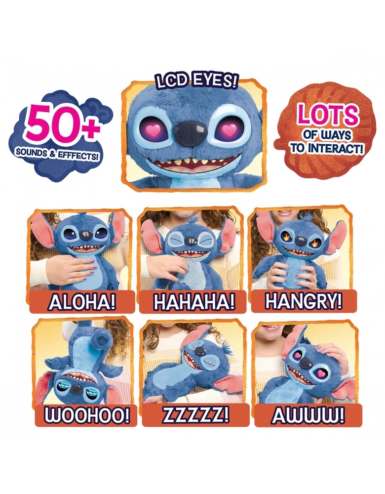 A pelúcia interativa do Stitch traz mais emoção e diversão para quem a abraça! Com olhos LCD que expressam diferentes emoções, ela reage de diversas maneiras, proporcionando uma experiência única. São mais de 50 sons e efeitos que tornam cada interação ainda mais divertida e realista. O Stitch pode rir, ficar feliz, dormir, ficar bravo e até sentir cócegas, tudo com a expressão dos olhos! Uma pelúcia encantadora que se adapta a diferentes momentos, trazendo alegria e surpresas para quem se aproxima.