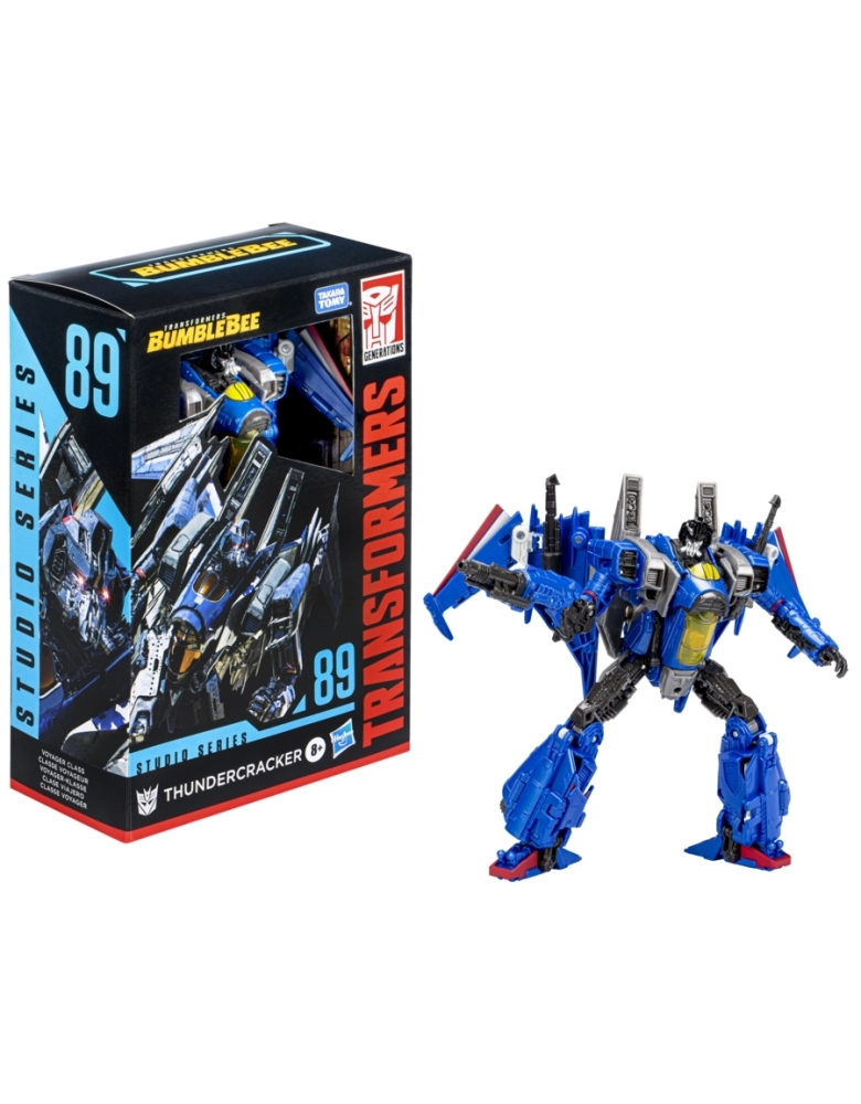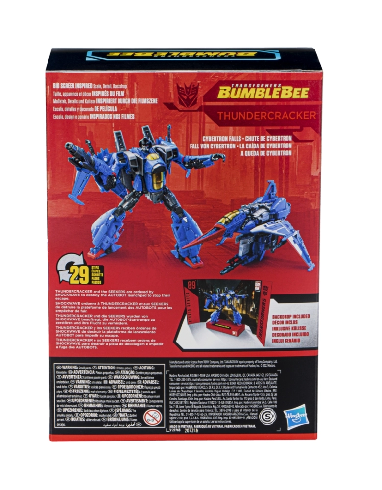 Para voltar à telona com figuras Studio Series de Transformers (vendidas separadamente) inspiradas nas cenas marcantes do filme e projetadas com especificações e detalhes que refletem o universo dos filmes Transformers, agora incluindo as figuras clássicas de Transformers: O Filme de 1986. A figura Thundercracker Studio Series classe Voyager inspirada no filme Transformers: Bumblebee apresenta uma conversão clássica e complexa do modo robô para o modo nave em 29 passos. O cenário removível apresenta a figura na cena da Queda de Cybertron. Na cena Queda de Cybetron do filme Transformers: Bumblebee, Thundercracker e os Seekers são ordenados por Shockwave a destruir a plataforma de lançamento do Autobot para impedir sua fuga. Os fãs podem colocar a figura na frente do cenário removível para imaginar este momento do filme. Transformers and all related characters are trademarks of Hasbro.