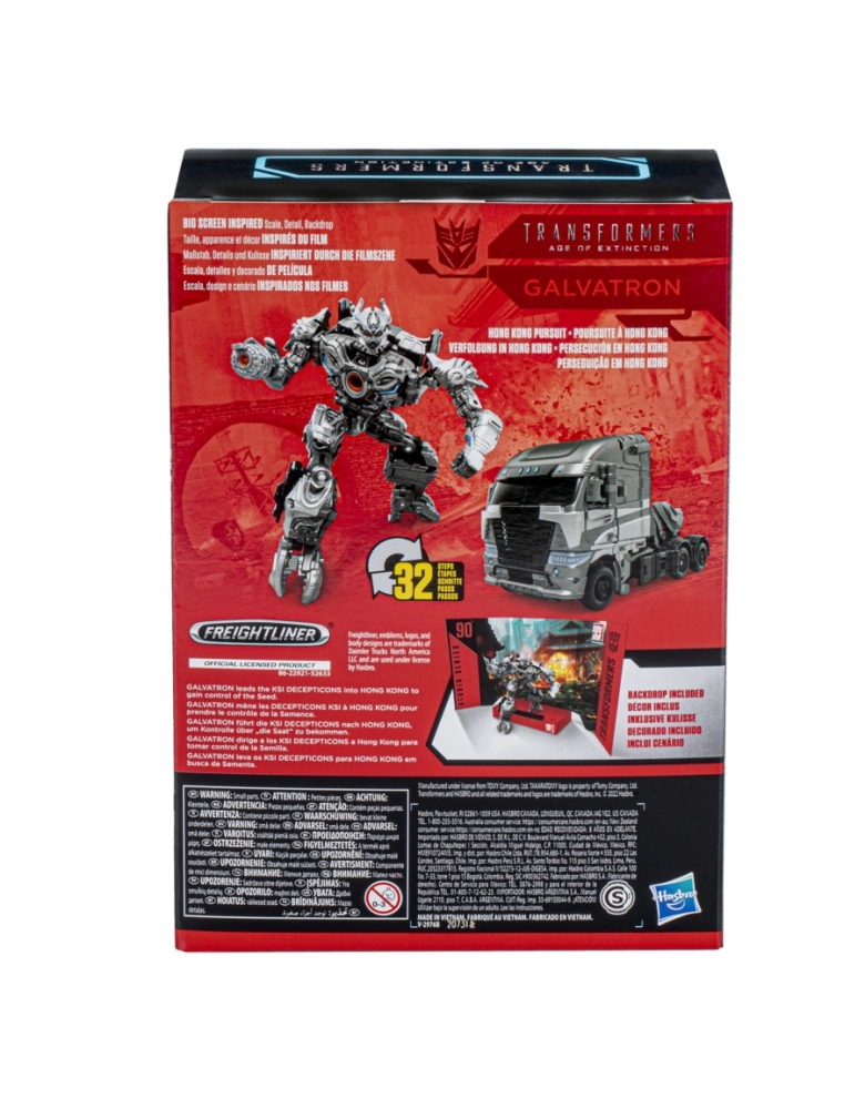 Para voltar à telona com figuras Studio Series de Transformers (vendidas separadamente) inspiradas nas cenas marcantes do filme e projetadas com especificações e detalhes que refletem o universo dos filmes Transformers, agora incluindo as figuras clássicas de Transformers: O Filme de 1986. A figura Transformers Studio Series class Voyager Transformers: A Era da Extinção apresenta uma conversão clássica e complexa do modo robô para o modo caminhão Argosy em 30 passos. O cenário removível apresenta a figura na cena da da Perseguição em Hong Kong, na qual Galvatron lidera os Decepticons KSI em Hong Kong para obter o controle da Semente. Com design inspirado pelo filme, a figura possui diversas articulações e vem com 1 arma. Transformers and all related characters are trademarks of Hasbro. Freightliner, emblems, logos, and body designs are trademarks of Daimler Trucks North America LLC and are used under license by Hasbro.