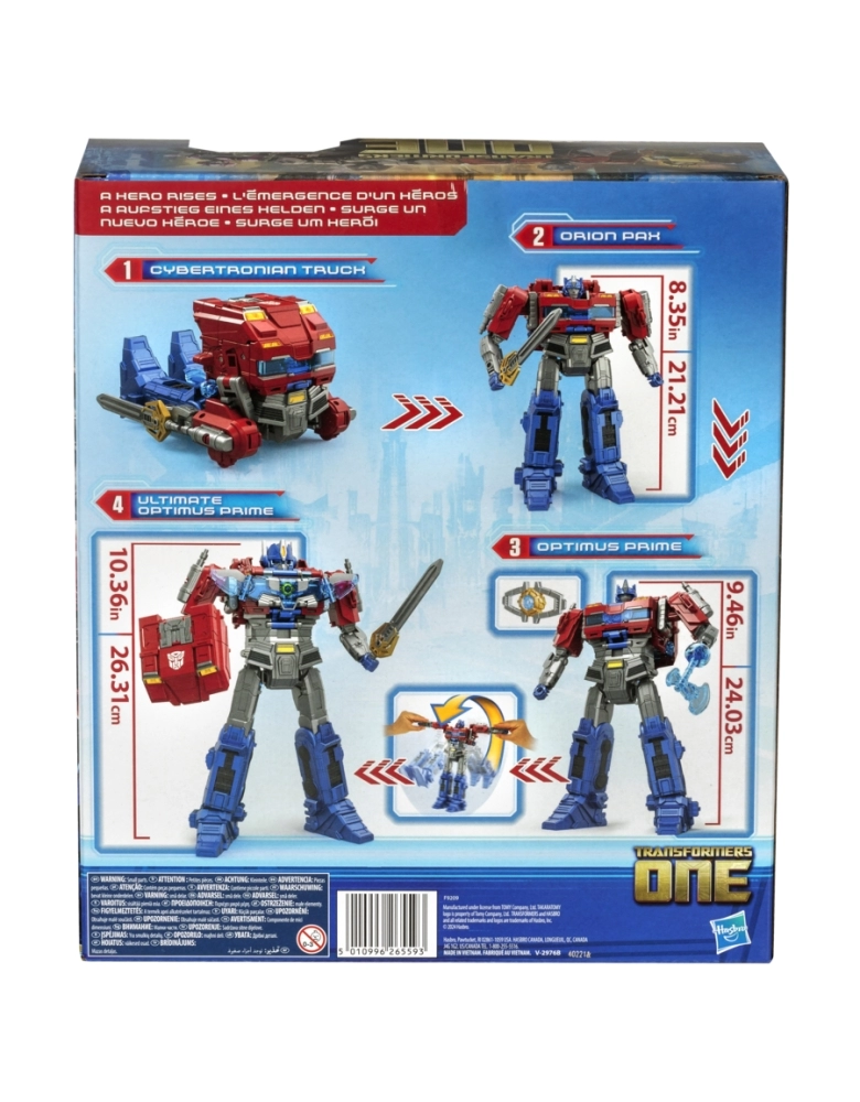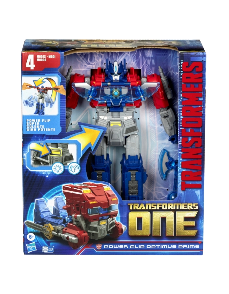 Conheça as origens épicas dos lendários robôs Transformers com esta figura Transformers One Power Flip Optimus Prime! A figura Optimus Prime converte-se em 4 modos diferentes: Orion Pax, caminhão Cybertroniano, Optimus Prime e Ultimate Optimus Prime. As crianças podem converter a figura Optimus Prime na figura Ultimate Optimus Prime. Basta girar a figura para convertê-la e a armadura de batalha é ativada automaticamente. Encaixar os acessórios para preparar a figura para a batalha. As crianças podem ativar luzes, sons e frases ao apertar um botão ou ao converter a figuras. As figuras Transformers são o presente ideal para meninos e meninas a partir dos 6 anos (vendidas separadamente e sujeitas à disponibilidade) Inclui 3 pilhas botão A76/LR44 Fala apenas em inglês. TRANSFORMERS and HASBRO and all related trademarks and logos are trademarks of Hasbro, Inc. Copyright 2024 eOne and Paramount Pictures Corporation. All Rights Reserved.