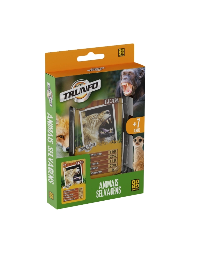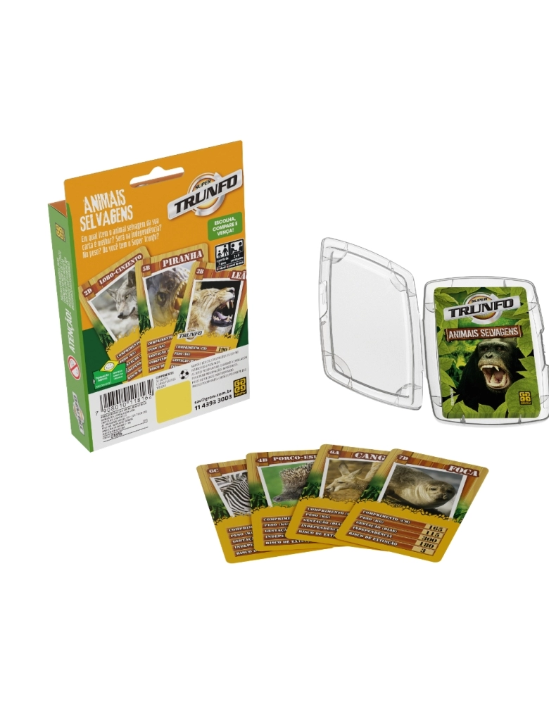 Super Trunfo Animais Selvagens traz 32 cartas com imagens e informações de animais selvagens para uma disputa superdivertida! Você compara sua carta com a do outro jogador. Mas escolha bem a característica que vai utilizar a cada rodada, pois, se sua carta ganhar, você fica com a carta do outro jogador; se perder, ele fica com a sua! No final, vence quem ganha todas as cartas do jogo.