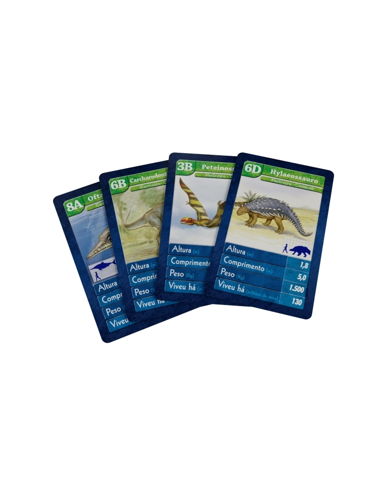 Super Trunfo Dinossauros traz 32 cartas com ilustrações e informações sobre os maiores seres vivos que já habitaram a Terra. Em qual item o dinossauro da sua carta é o melhor? Será em altura? Em peso? Ou você tem o Super Trunfo? Escolha, compare e vença esta emocionante disputa