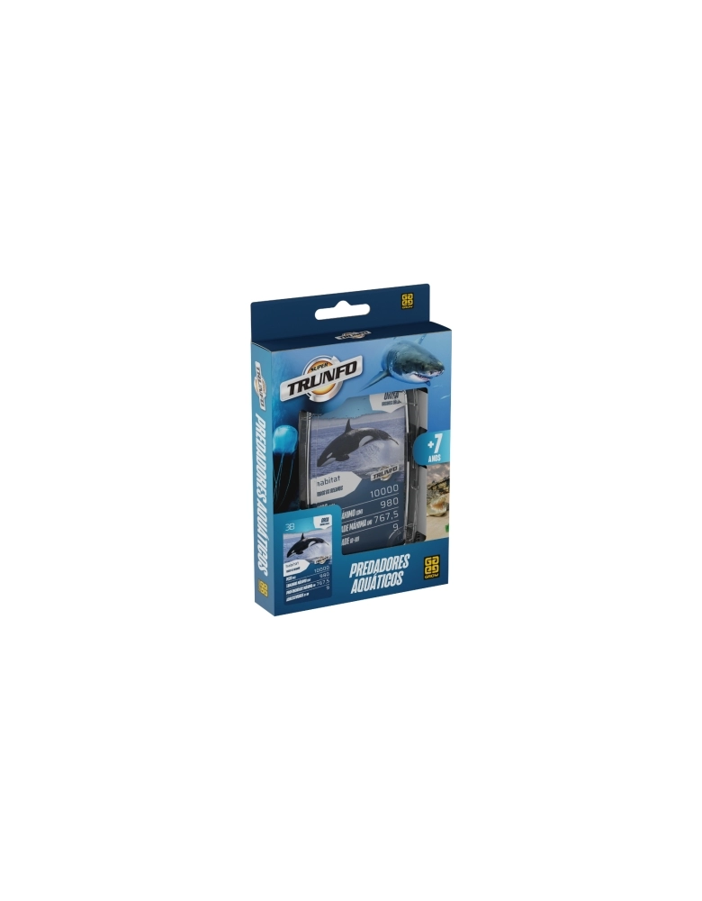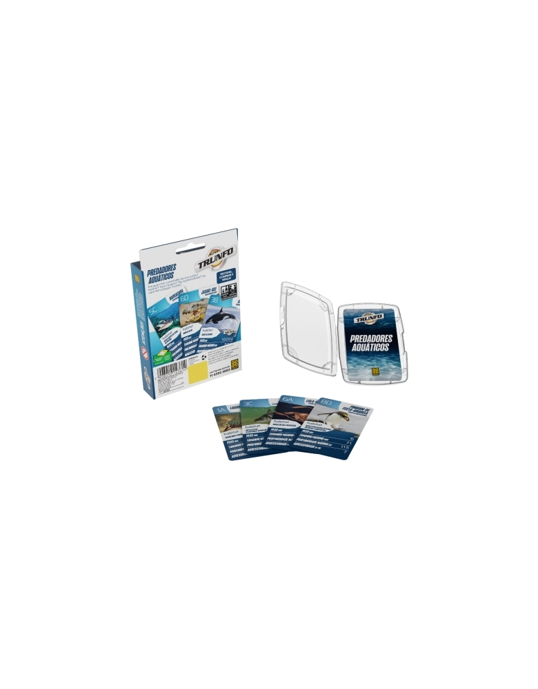 O Super Trunfo Predadores Aquáticos traz 32 cartas com ilustrações e informações sobre os maiores predadores do mundo aquático.