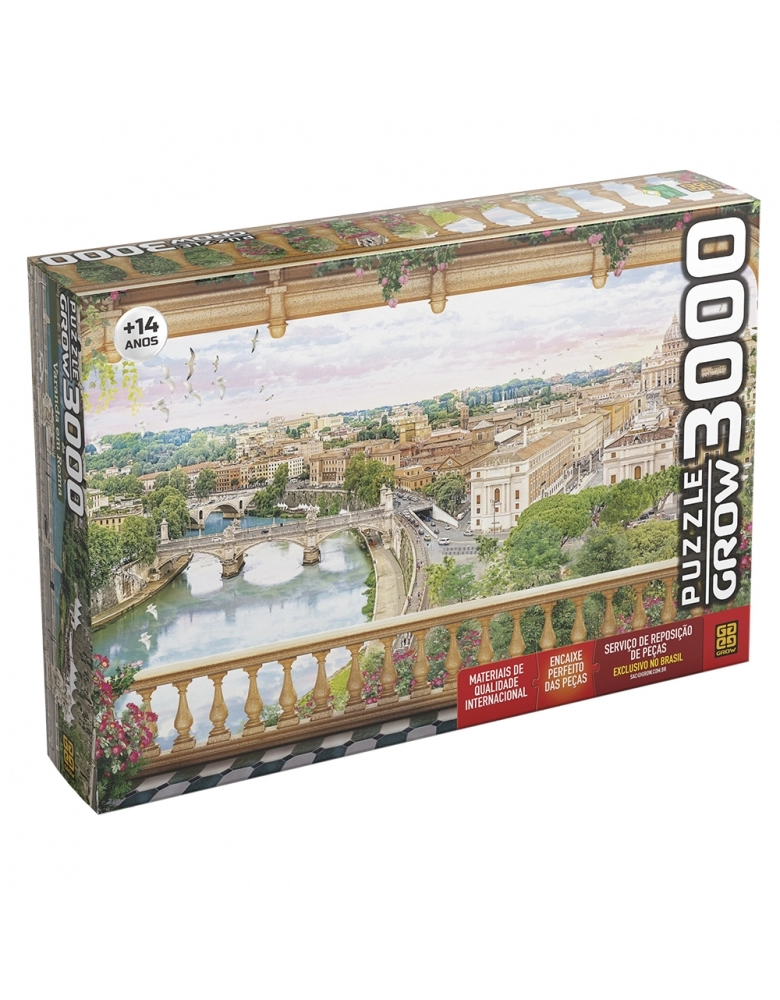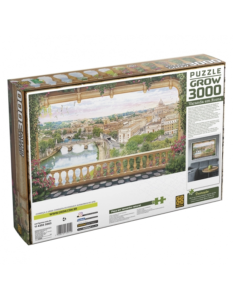 A Grow é pioneira e referência em quebra-cabeças no Brasil, desde 1977. Os melhores materiais são cuidadosamente selecionados sempre buscando qualidade para garantir um encaixe preciso e uma ótima experiência de montagem. Roma é a capital da Itália e também da Região do Lácio. Possui 2,8 milhões de habitantes, sendo a maior cidade italiana e a quarta mais populosa da União Europeia. O Vaticano fica dentro de seu território, fazendo com que a cidade seja a única no mundo a possuir um país em seu interior. Conhecida como “A Cidade Eterna”, Roma teve papel fundamental no desenvolvimento da cultura e da arte europeias, e tem sua grande importância devido à história que vem construindo há mais de 2.500 anos. Suas construções também marcam presença como diferencial. Ao fundo, pode-se ver a Basílica de São Pedro, que teve a contribuição de alguns dos artistas mais renomados, como Rafael e Michelangelo, em sua construção. O Rio Tibre e suas pontes tornam a cidade mais romântica. O verde das árvores dá uma agradável leveza a esta paisagem vista de uma admirável varanda.