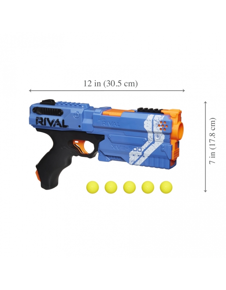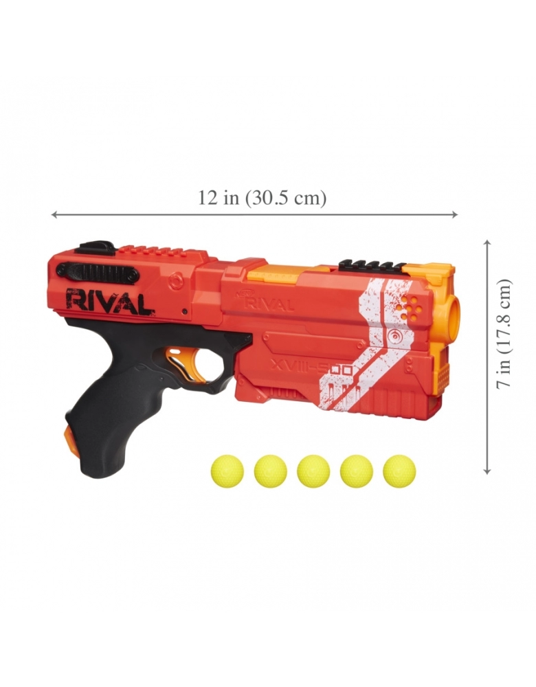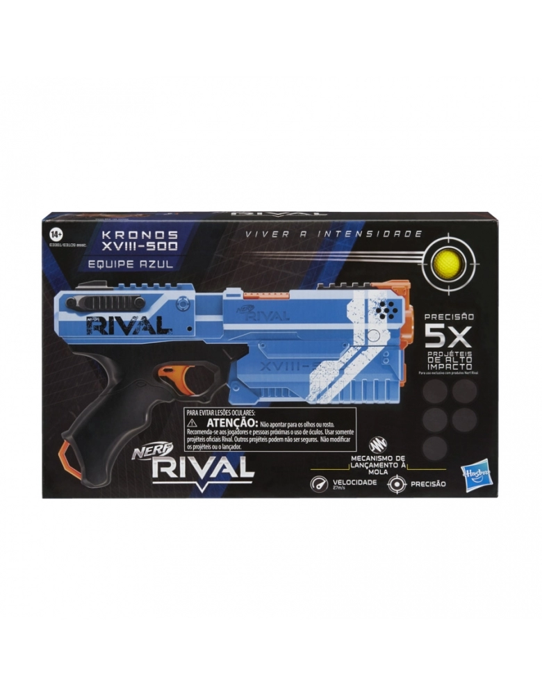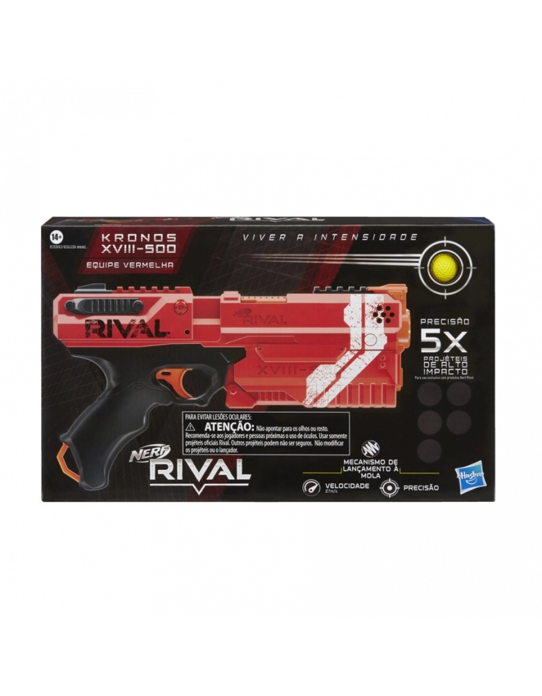 O lançador Kronos XVIII-500 de Nerf Rival traz muita ação! 5 projéteis podem ser inseridos na câmara de recarga. O lançador deve ser preparado com o mecanismo de mola e a alavanca de disparo deve ser ativada para lançar um projétil a até 27 m/s de velocidade. O lançador também possui uma trava para evitar lançamentos acidentais, um indicador para mostrar quando o lançador estiver preparado e um trilho tático que pode ser personalizado com equipamentos e acessórios da Nerf Rival (vendidos separad