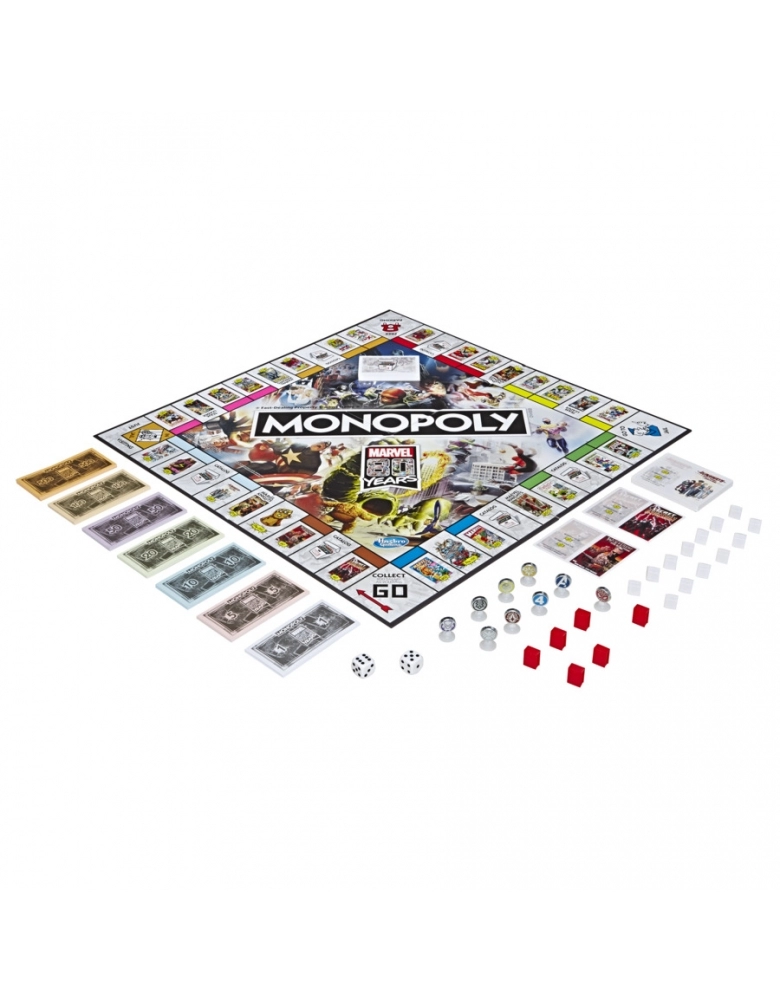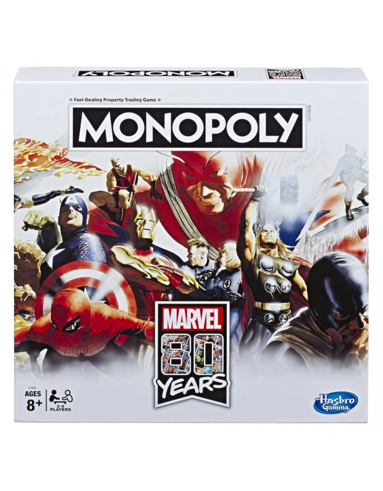 O Jogo de tabuleiro Monopoly: Marvel 80 Anos comemora o catálogo épico de quadrinhos da Marvel. Com inspiração no Universo Marvel e em sua marcante arte -- incluindo de artistas como Alex Ross -- este jogo é essencial para os fãs Marvel. Os espaços de propriedades incluem Capas, Cavaleiros Marvel e Líderes de Equipe, e em vez de casas e hotéis, esta versão do jogo apresenta revistas e compêndios. O último jogador a ficar no jogo com dinheiro é o vencedor. - JOGO EM INGLÊS COM MANUAL EM PORTUGUÊS