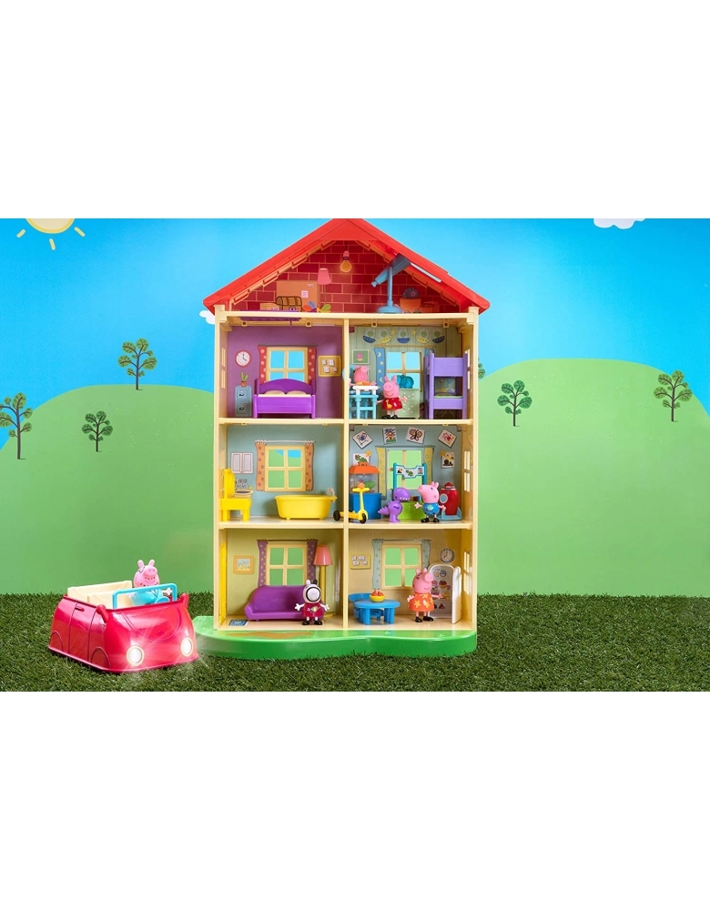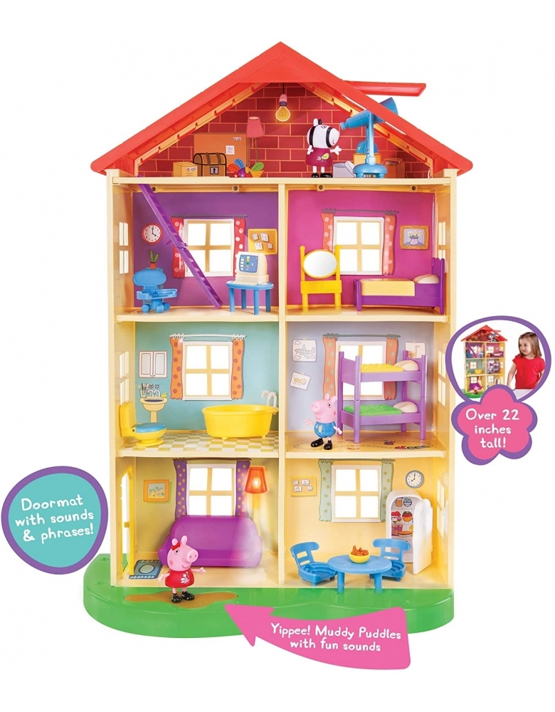 Experimente todos os ambientes da casa da família Pig e desfrute de um dia na vida da porquinha favorita de todos! A casa possui 7 ambientes e 11 peças exclusivas! Também inclui figuras articuladas da Peppa e George para infinitas maneiras de brincar. Para a brincadeira ficar ainda mais emocionante, utilize a escada dobrável para subir até o sótão e abra a janela do telhado para olhar o céu. Cada cômodo pode ser ambientado com os móveis e acessórios para personalizar ainda mais a sua casa