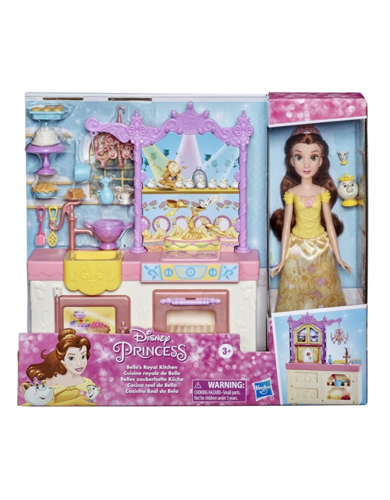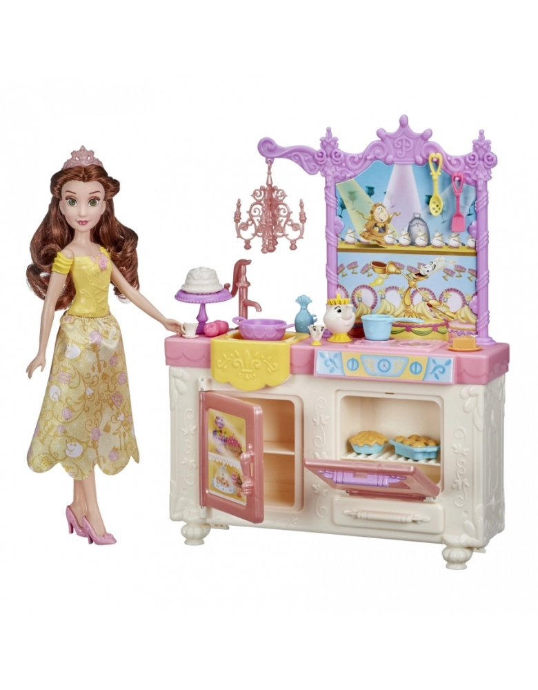 As crianças podem imaginar a princesa Bela cozinhando para os seus amigos com este brinquedo. O kit inclui a boneca Bela com uma saia removível no tema de cozinha, sapatos e uma tiara. Com um candelabro pendurado num gancho, o kit Cozinha real da Bela inclui uma geladeira, um fogão, e inclui pinos para pendurar os vários acessórios. Vem com bolo, base, torta, muffins, xícara, maçãs, panela e muito mais. E só porque é muito mais divertido cozinhar com os amigos, o kit também vem com dois amigos encantados da Bela, a Madame Samovar e Zip, do filme A Bela e a Fera. Este kit é um lindo presente para crianças acima de 3 anos e para fãs das princesas da Disney. (Outras bonecas vendidas separadamente. Sujeitas à disponibilidade).