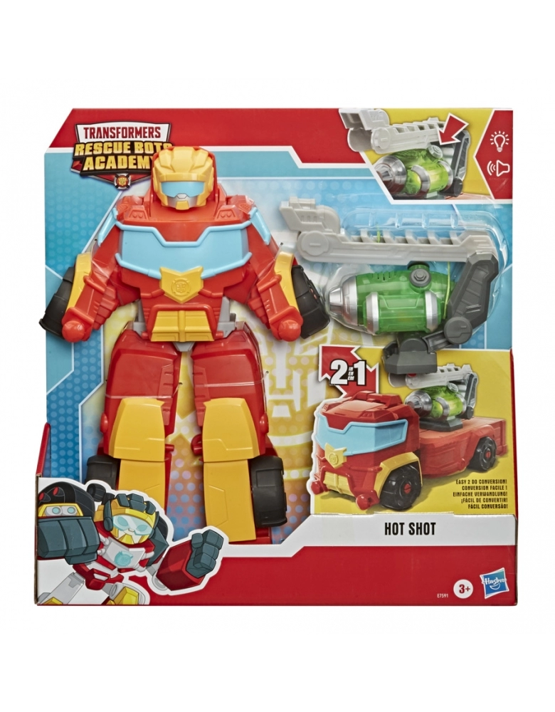 Escolhido para ser o herói em treinamento da academia Rescue Bots pelo próprio Optimus Prime, Hot Shot é o herói da equipe! As crianças podem se imaginar em grandes aventuras com os seus personagens favoritos de Transformers Rescue Bots Academy! Com conversão fácil e tamanho ideal para mãos pequenas, o brinquedo Hot Shot se converte do modo robô ao modo veículo em um passo simples! No modo robô, a figura Hot Shot tem um botão de resgate divertido como visto na série animada. Os meninos e as meni